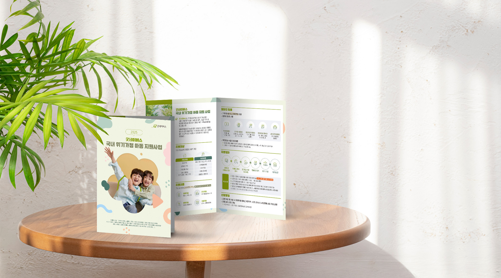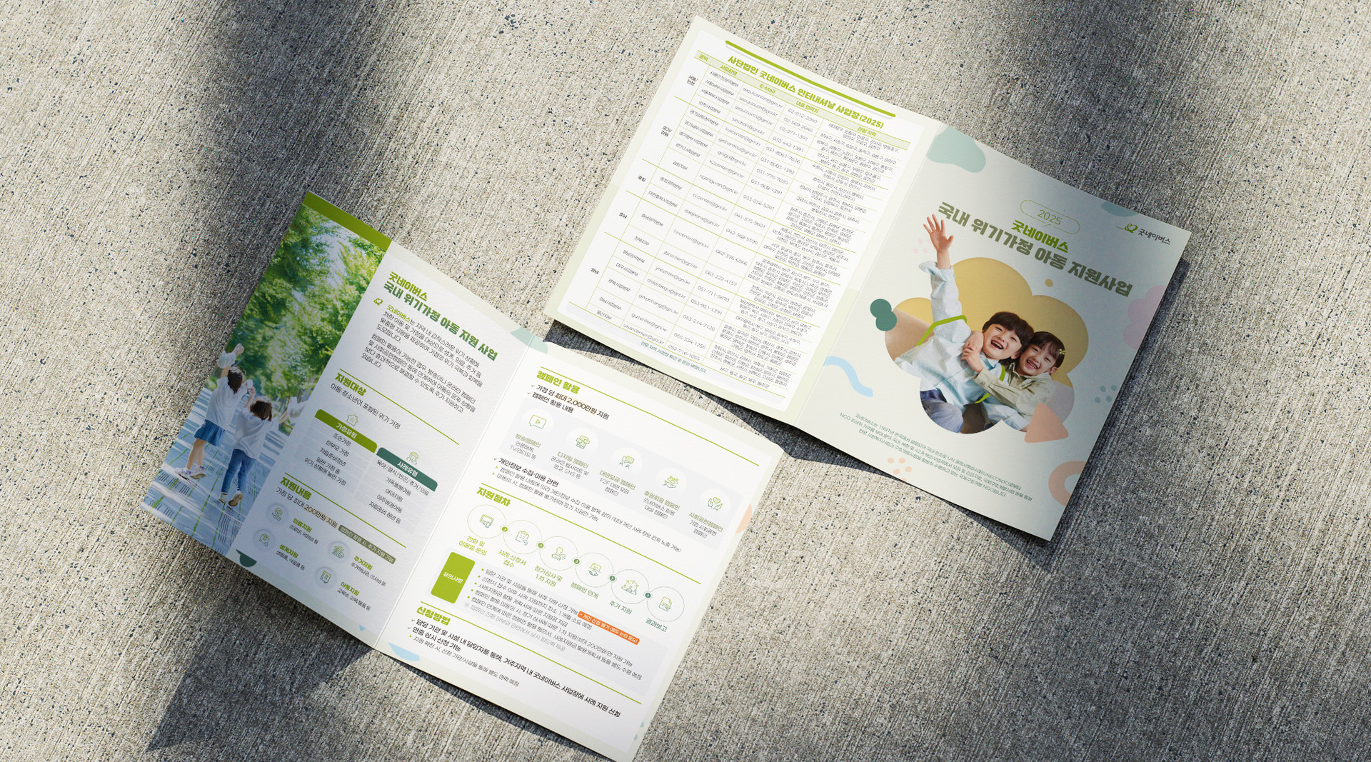 경제적 어려움 등으로 도움이 필요한 아동·청소년들이 학업을 지속하고 심리적 안정을 되찾아 건강하게 성장할 수 있도록 장기적 지원 및 자립 체계의 기반을 마련하는 국내위기가정아동 지원사업 홍보 리플렛 디자인 작업을 진행하였습니다. 밝고 아기자기한 느낌으로 리플렛 접근성을 높이고자 하였습니다.