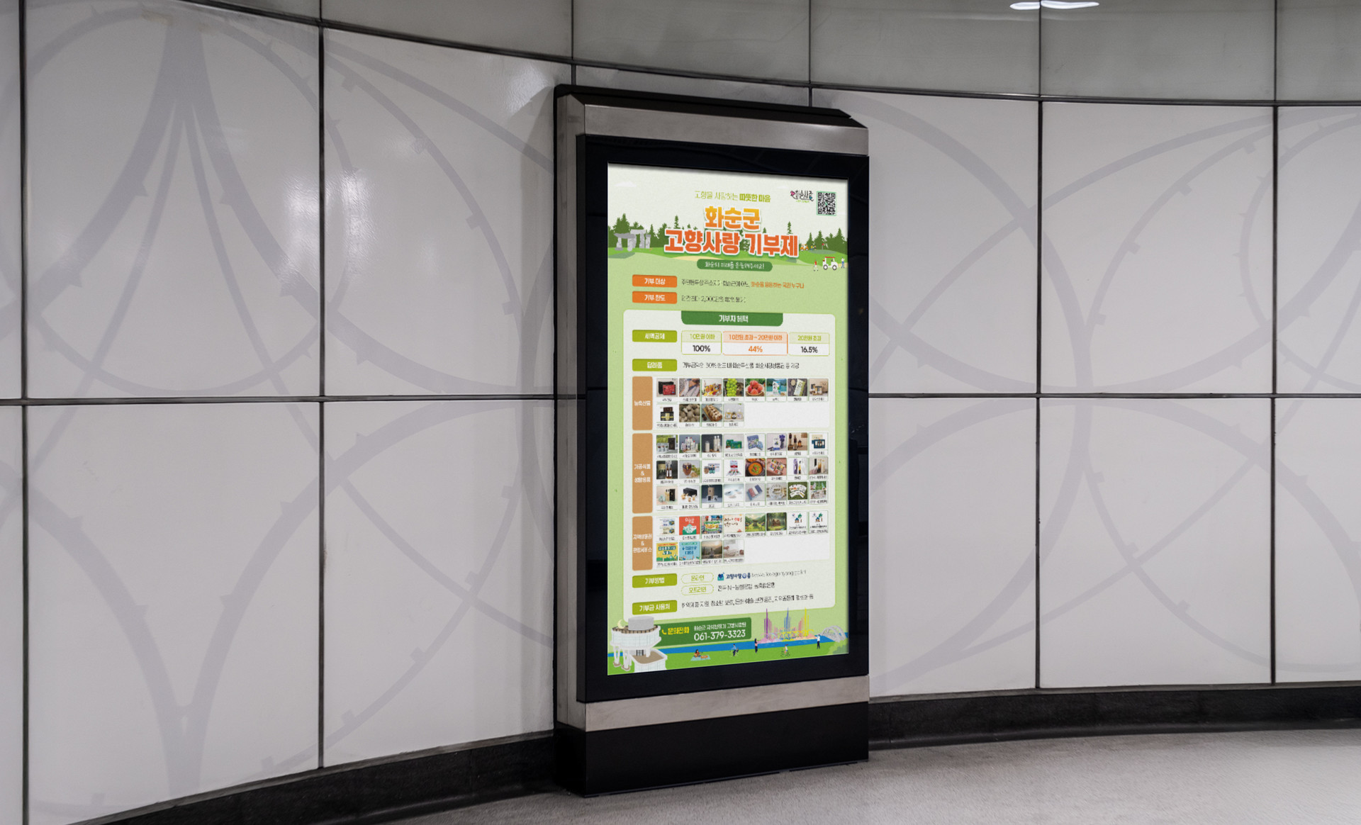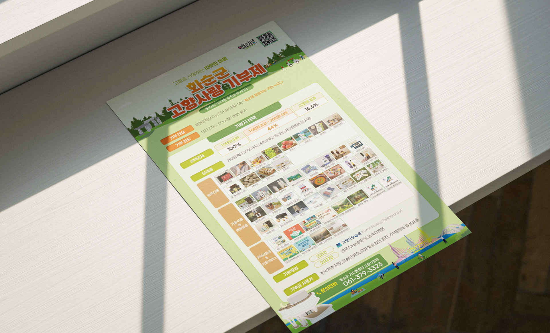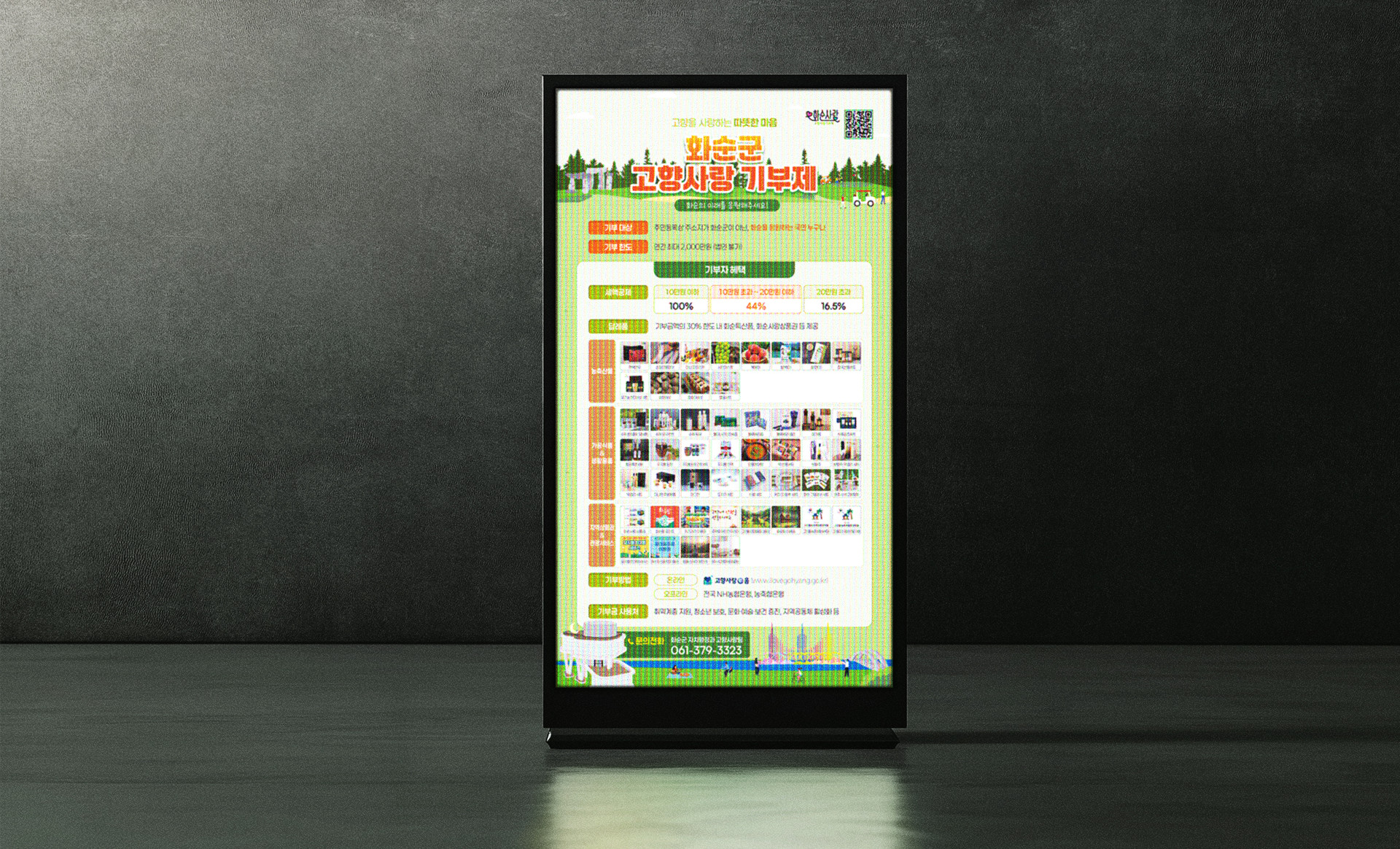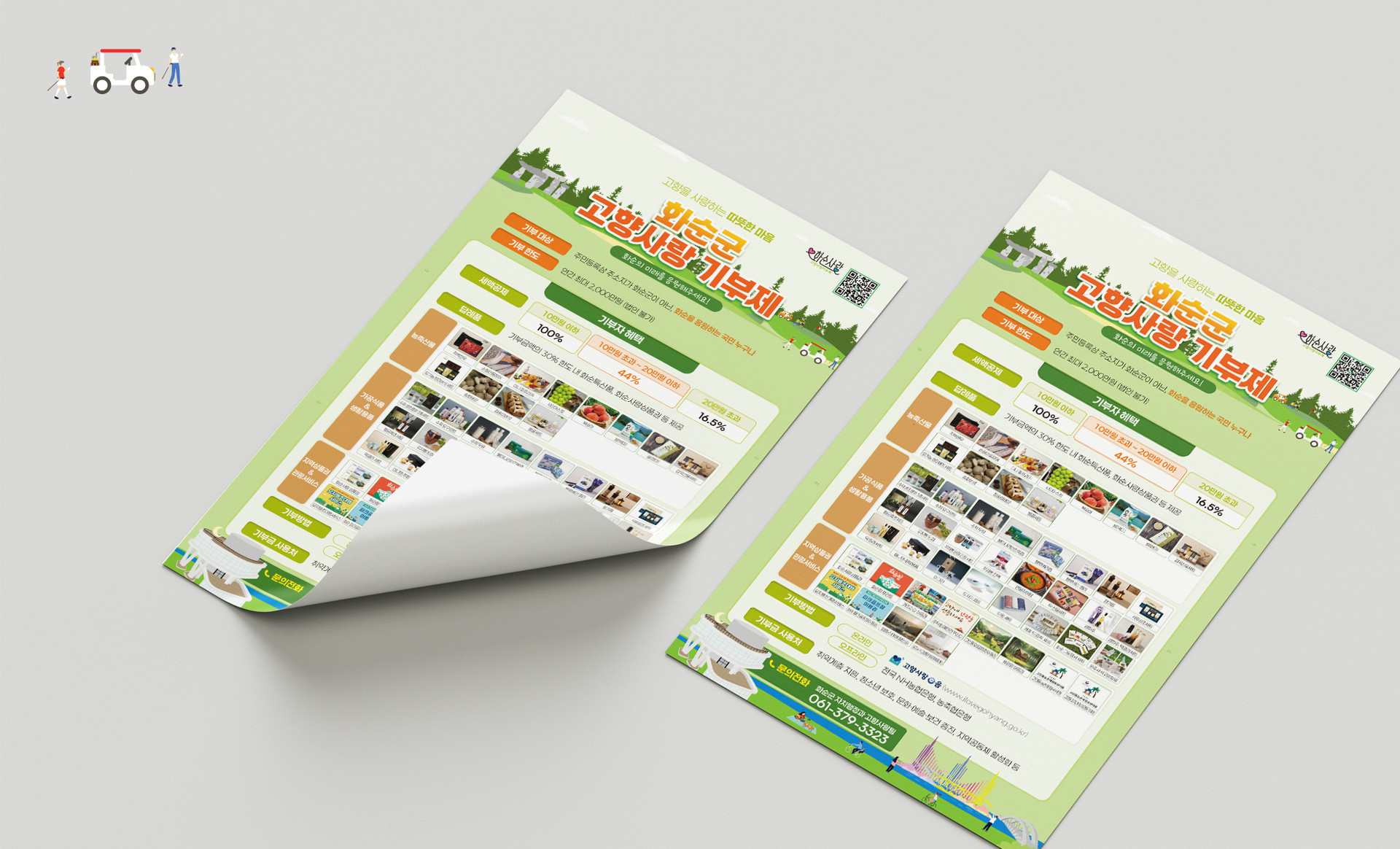 화순군의 대표 관광명소인 고인돌, 파크골프장, 음악분수, 개미산 전망대를 일러스트 요소로 구성했습니다.